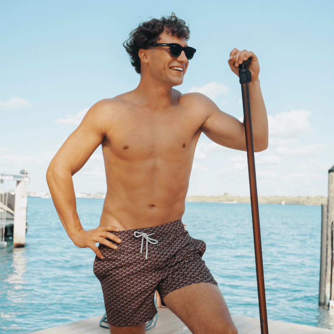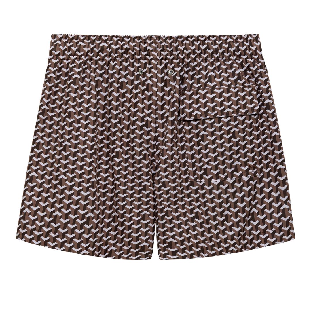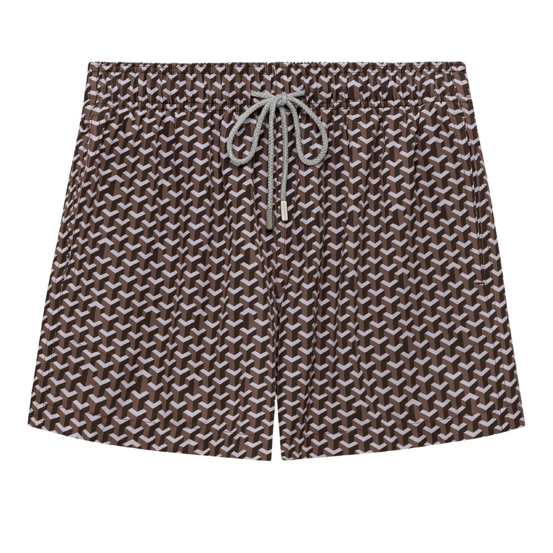 The Le Club Geo Brown Swim Shorts blend a luxe geometric design with a tailored silhouette, offering a timeless yet contemporary resort look. A refined choice for days spent between sea, sun, and stylish settings.