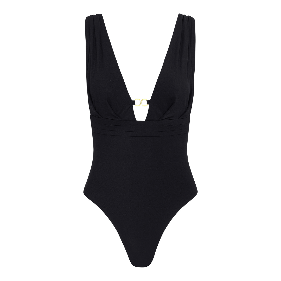 Introducing the Le Club Sophia Nero One-Piece — a refined, sculpting silhouette elevated by a deep V-neckline and a touch of gold hardware. Understated yet striking, it brings effortless sophistication to every swim moment.