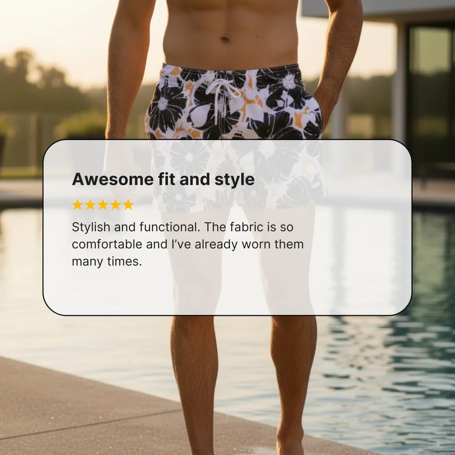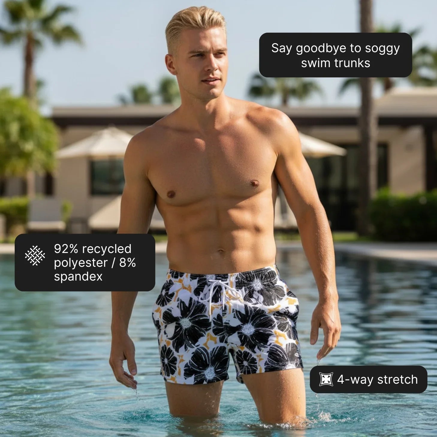 The new Le Club Bloom Swim Shorts‚ a modern, colorful, and eco-friendly choice that will make you stand out in style. These swim shorts feature a unique black, white and yellow flower print design, adding a touch of color and fun to your swimwear collection.