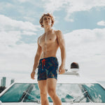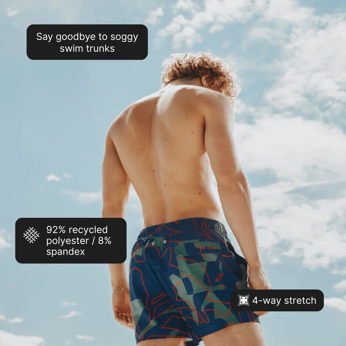 The new Le Club Quest Swim Shorts‚ a versatile and eco-friendly choice that will bring a pop of color to your swimwear collection. These swim shorts feature a modern abstract pattern with vibrant orange details, adding a touch of artistic flair to your beach and poolside look.